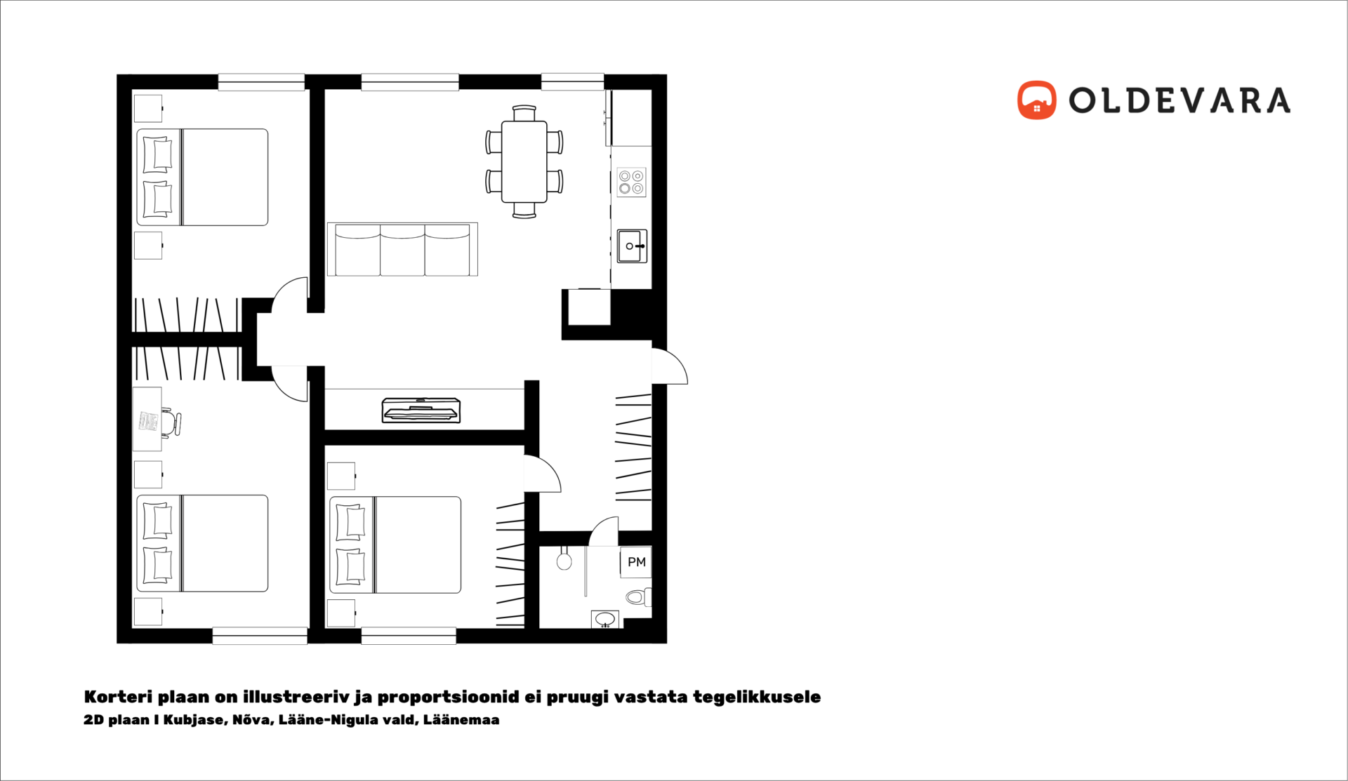 Korteri kooseisu kuulub esik, wc/vannituba, kolm ruumikat magamistuba ja elutuba avatud köögiga.